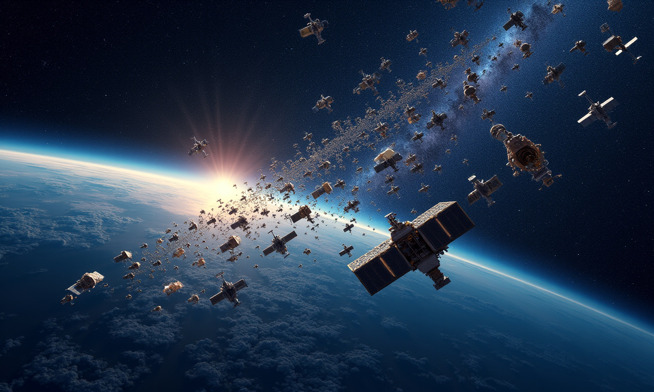 The illustration depicts the crowded low Earth orbit.